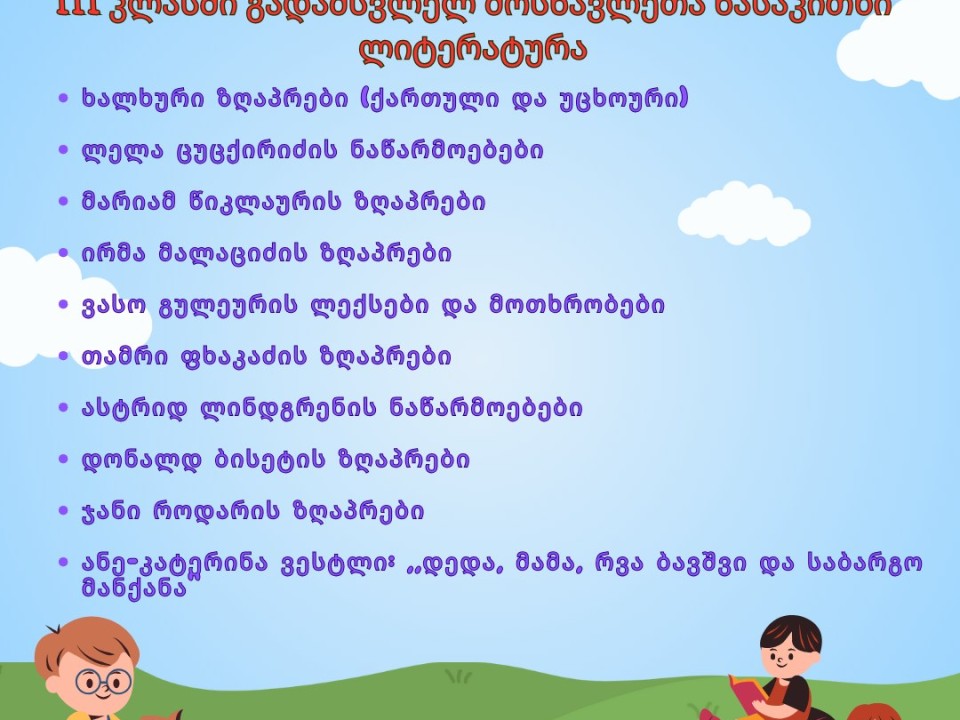 📚 ძვირფასო მოსწავლეებო, გიზიარებთ ჩვენი სკოლის პედგოგების მიერ შერჩეული ლიტერატურის ნუსხას, რომელიც მკითხველის ასაკის მიხედვით დავალაგეთ.